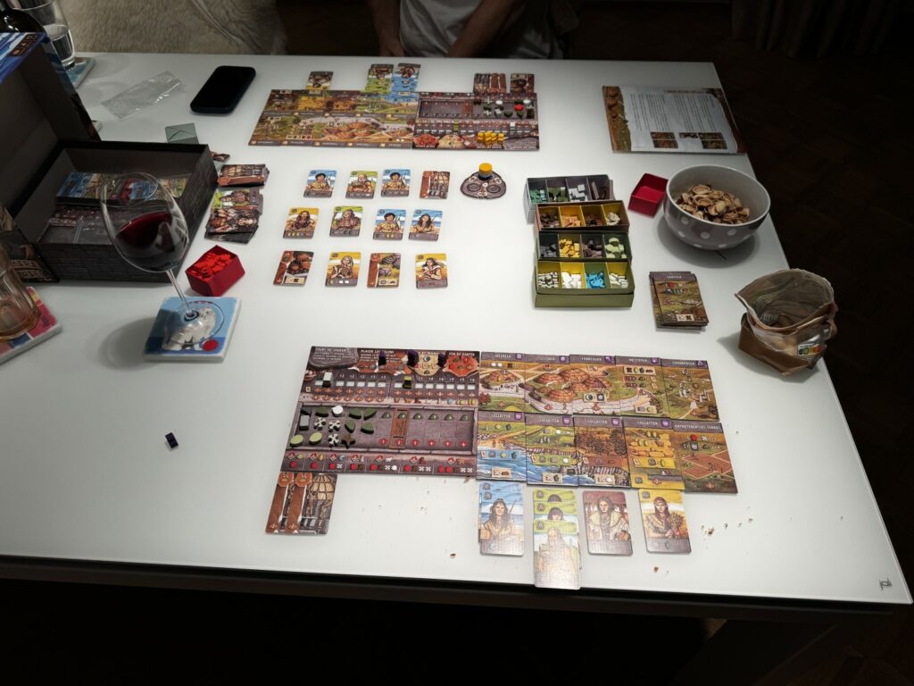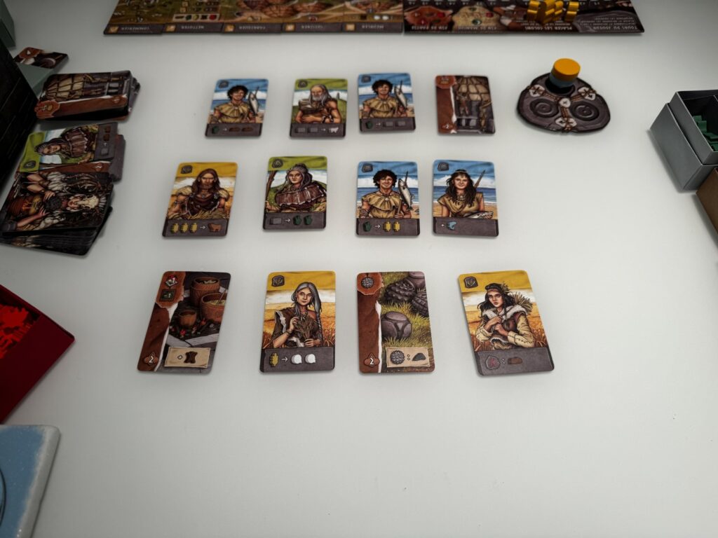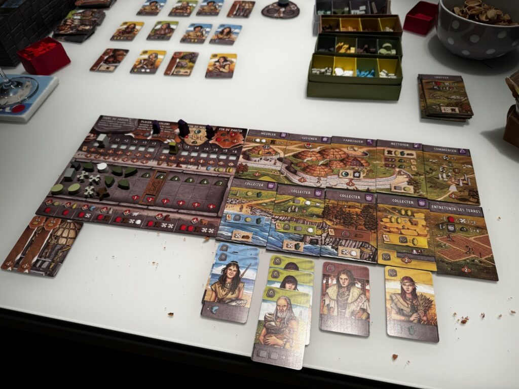 Le jeu se joue en 4 manches divisées chacune en 3 phases d’acquisition de cartes. On dispose les cartes village en 3 ligne et, pour chaque ligne, chaque joueur, à son tour, va prendre une carte, la poser sur sa zone de jeu, récolter obligatoirement les ressources qu’elle produit, puis, jouer ses ouvriers sur ses cartes actions. Les actions sont assez simples: récolter des ressources ou les dépenser pour améliorer ses tuiles action et les rendre plus puissantes, pour cuire de la nourriture afin de nourrir tous ses villageois (les cartes), augmenter sa capacité de cuisson, gagner des PVs ou se débarrasser de ses déchets… A la fin de chaque manche en effet, en fonction de la quantité de ressources dans votre stock, vous allez produire plus ou moins de déchets qui, eux-mêmes, prendront de la place dans votre stock. Mieux vaut s’attaquer au problème dès le début pour éviter les effets boule de neige 🙂