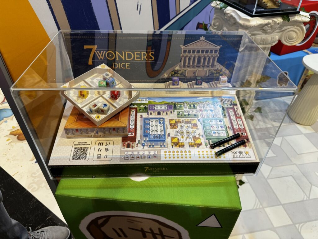 Asmodée ne manque pas d’initiatives pour mettre 7 Wonders Dice en avant. Ici un cube présentoir pour les boutiques, il suffit de scanner le QR code pour se voir expliquer les règles et comprendre l’utilité du matériel présenté.