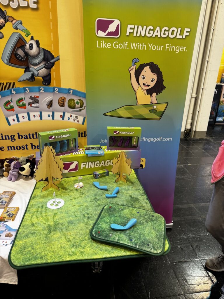 Peut-être bien l’OLNI du salon: un jeu de golf avec les doigts. On enfile la petite crosse autour de notre index et on arrive à faire de jolis coups. Le présentateur nous a démontré sa dextérité en plaçant le petit tapis en néoprène, par terre, 1 mètre plus bas et 2 mètres plus loin et en tapant une balle qui, au premier coup, est arrivée à côté du drapeau situé sur cette table. Bravo!