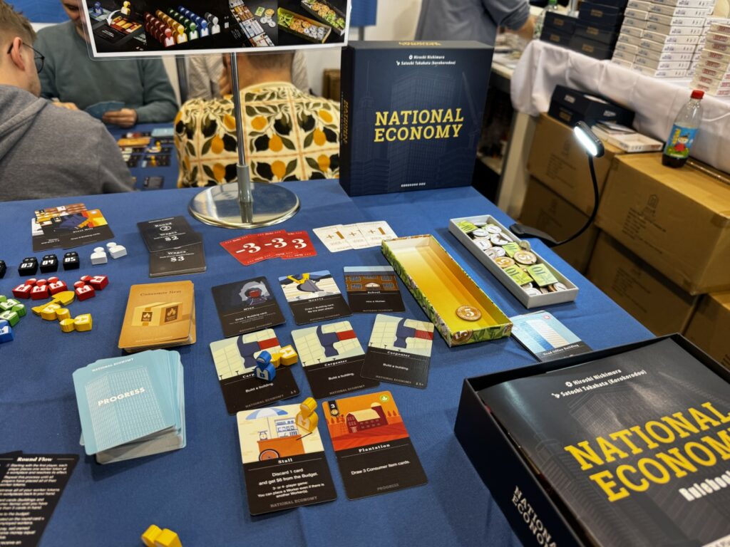 National Economy, un jeu de placement d’ouvriers et d’engine building où on place et retire ses ouvriers pour construire des bâtiments chez soi et profiter, seul, de ses effets. On y revient, c’est sûr.