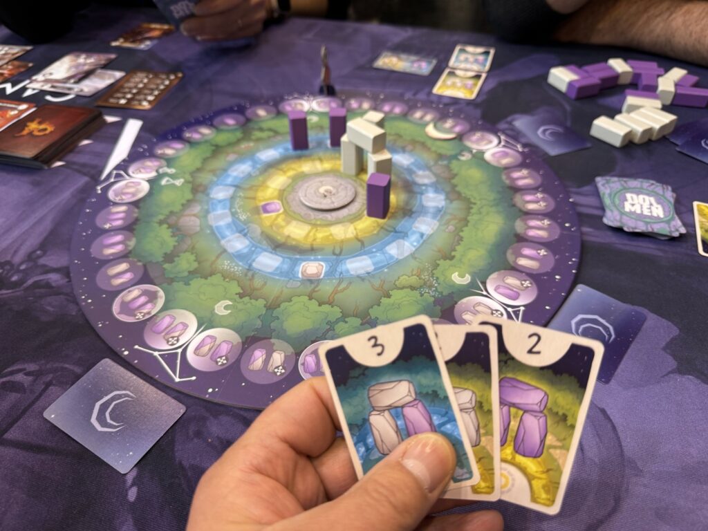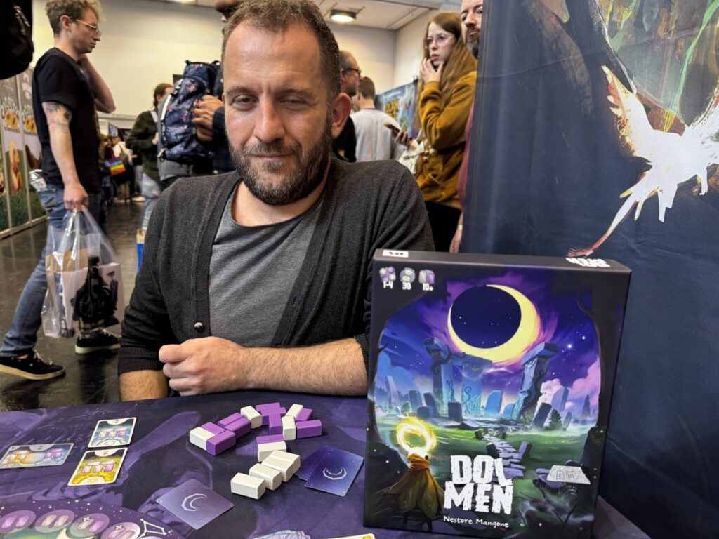 Un partie de Dolmen, un jeu à venir, avec son auteur, Nestore Mangone, rien de moins que l’auteur de Darwin’s Journey, Newton, Shackleton Base ou Stupor Mundi.