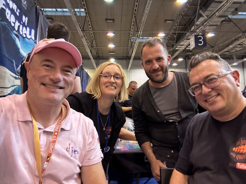 Et, outre Nestore, j’y ai joué avec d’autres illustres et sympathiques acteurs ludiques de Tu joues ou quoi (à prononcer avec un chouia d’énervement 😉 ). Encore une belle rencontre. Je vous encourage à regarder leur vidéo sur Essen très intéressante 🙂