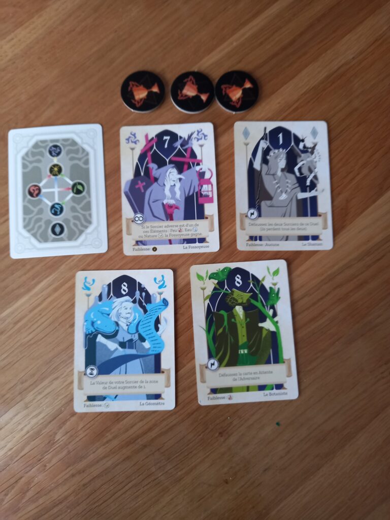 Puis chacun choisit 5 cartes pour la manche. Une carte sera posée en réserve face cachée. Les 5 autres cartes seront agencées par le joueur dans l’ordre ou il veut les jouer. Ce choix est crucial pour la victoire. Chaque manche se déroule donc selon 5 duels ou les sorciers s’affrontent sans merci.