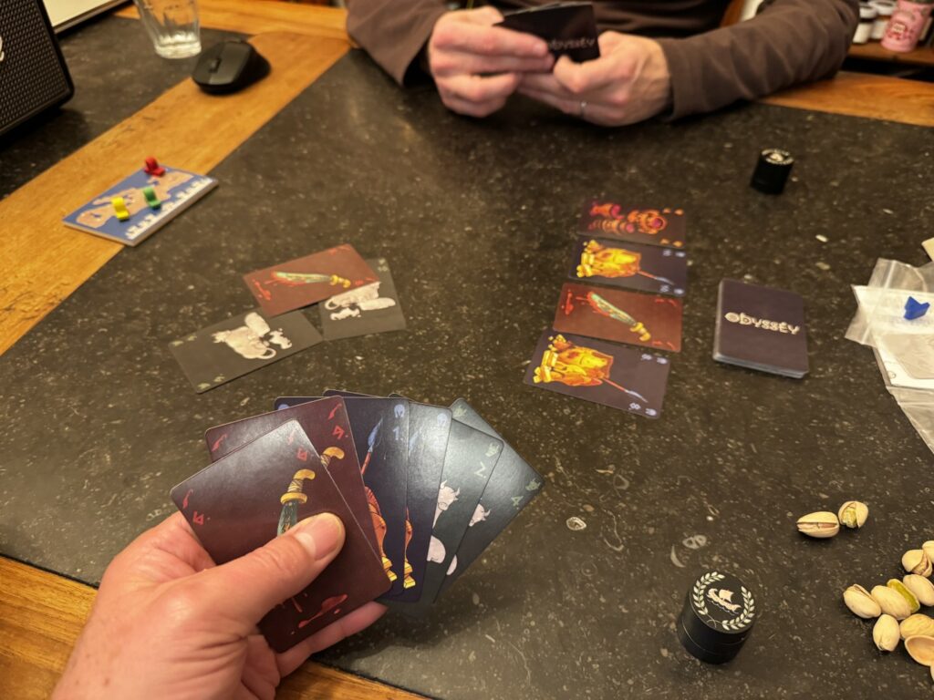 Odyssey est un jeu de plis classique (must follow may cut) proposant des petits twists intéressants. Les joueuses jouent en effet avec 2 mains. Leur propre main et la main du « non-joueur neutre ». Elles disposent de 3 jetons qui, en les défaussant, leur permettent de jouer depuis la main du neutre. La règle du must follow may cut s’applique à chaque main séparément. Si on joue vert et que j’ai du vert, je peux soit suivre, soit jouer un de mes 3 jetons pour jouer depuis la main du neutre et si ce dernier n’a pas de vert, couper ou jouer une autre couleur.