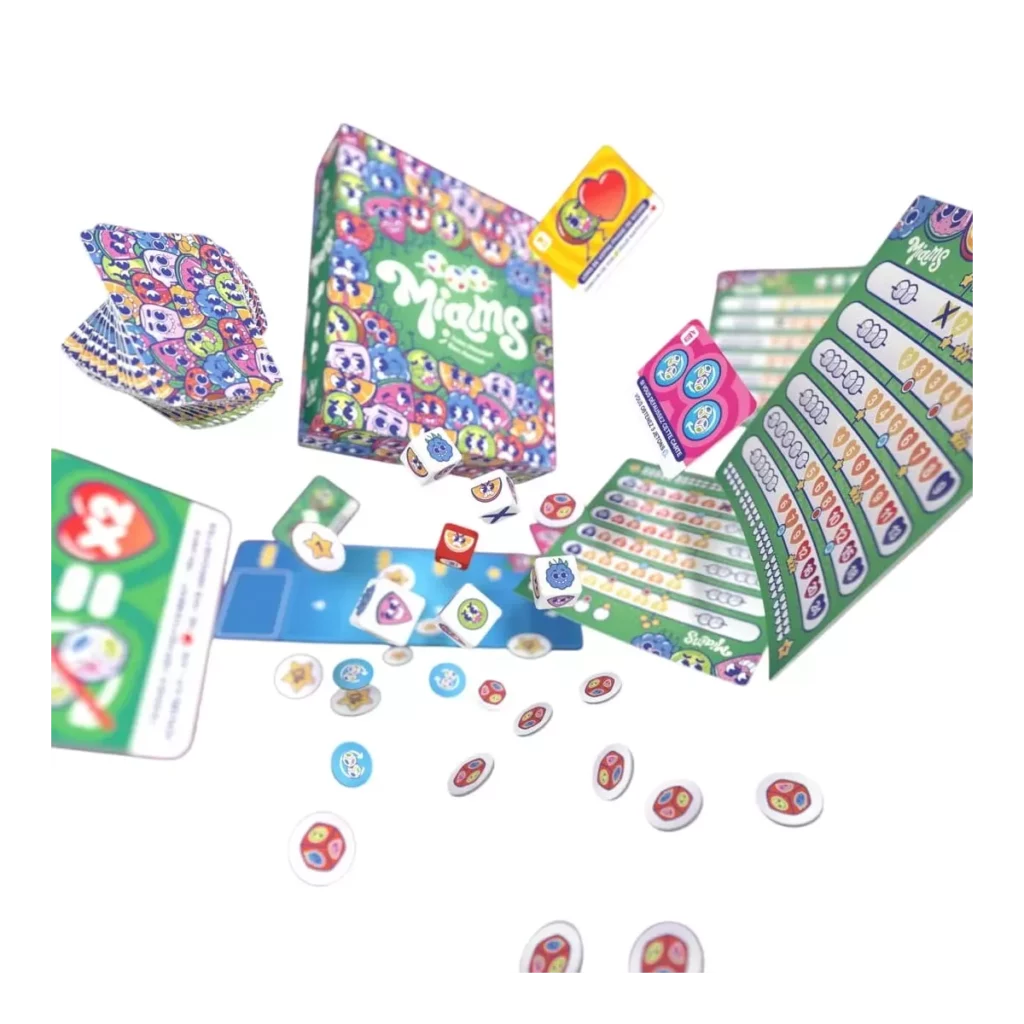 Miams est un jeu d’ambiance survitaminé. L’auteur Jules Messaud, l’illustrateur Ben Renault et l’éditeur,  Kyf Éditions ont fait un roll and write fruitier sur la base du yams. Dans ce jeu, vous allez faire des brochettes de fruits qui vont vous rapporter des cœurs, des étoiles et dans certains cas un jeton relance, ou la possibilité d’utiliser un dé additionnel.