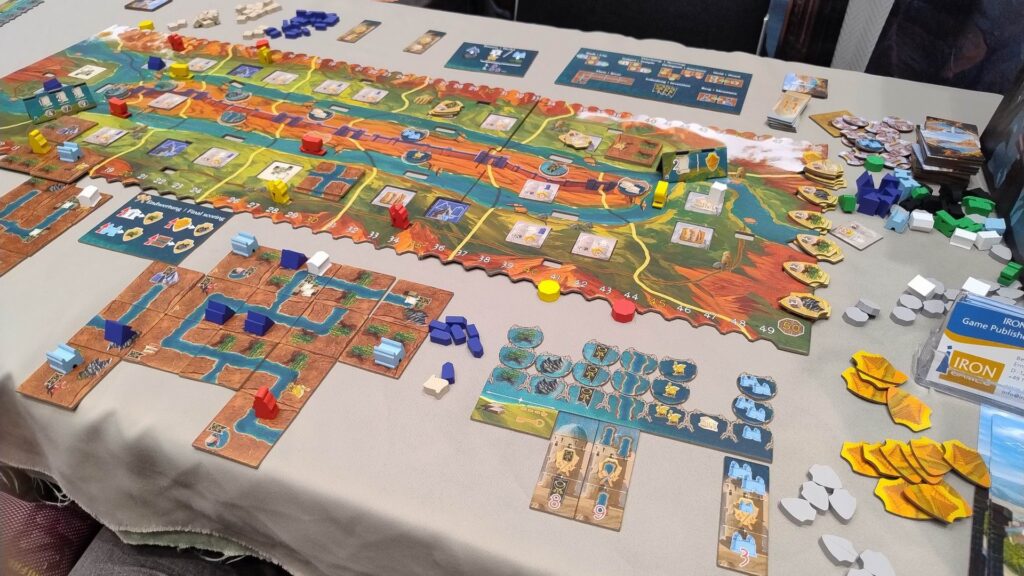 Dans Papyria, on va naviguer son bateau ou déplacer ses voyageurs le long de l’Euphrate pour récolter des ressources ou des tuiles, construire son paysage avec des nouvelles tuiles et bâtiments et gagner des PVs. Déplacer ses voyageurs ou bateaux se fait en rond, un peu comme avec la fameuse « rondelle de Gerdts« . Construire son paysage va aider à rendre les actions plus puissantes en permettant de récolter plus de ressources ainsi que de gagner plus de PVs. En effet, de nombreuses façons de marquer des points dépendent de votre paysage et de ce que vous y avez construit.