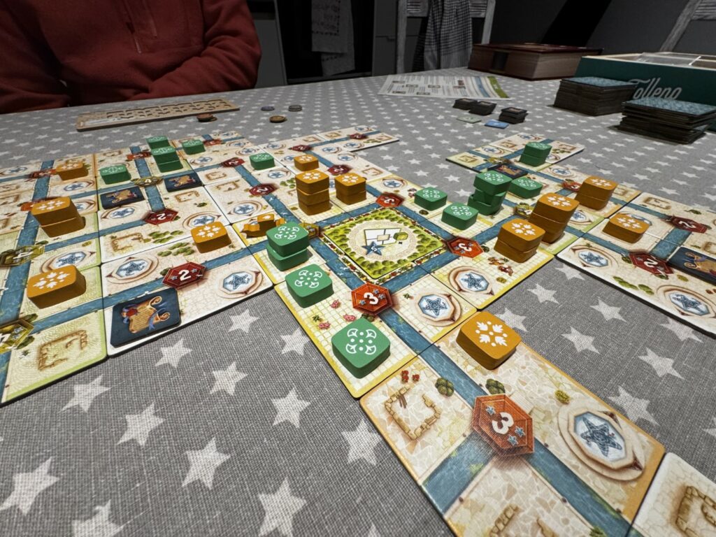 Tolleno est un jeu de placement de tuiles qui sort un peu de l’ordinaire, mais ça, j’y reviens. Car la première chose à dire est le travail d’édition magnifique: le jeu est beau, il donne envie d’y revenir. Et le matériel est de qualité!