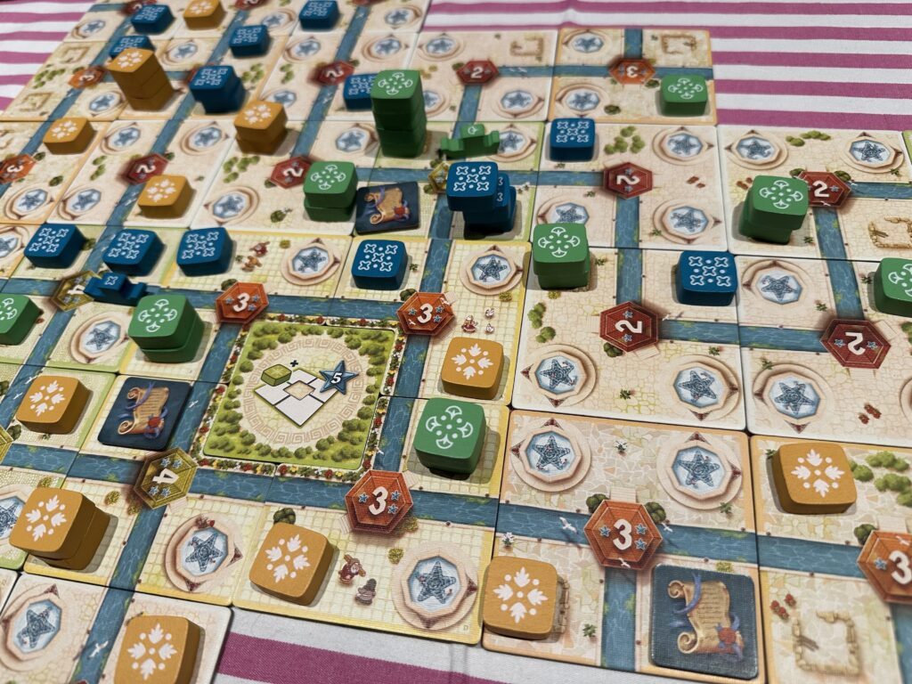 On commence son tour par placer la tuile qu’on a dans sa main (on en pioche une à la fin de son tour) sur le plateau en prolongeant un des canaux et en plaçant, sur le canal prolongé un de ses jetons. Chaque tuile a une ville en son centre qui apporte entre 2 et 4 PVs au joueur majoritaire (en hauteur) adjacent à elle. Le hasard va jouer son rôle ici car si on tire des villes de plus grande valeur, on aura un avantage sur ses adversaires puisqu’on va pouvoir y placer en premier un de ses jetons et donc, prendre l’avantage pour la majorité.