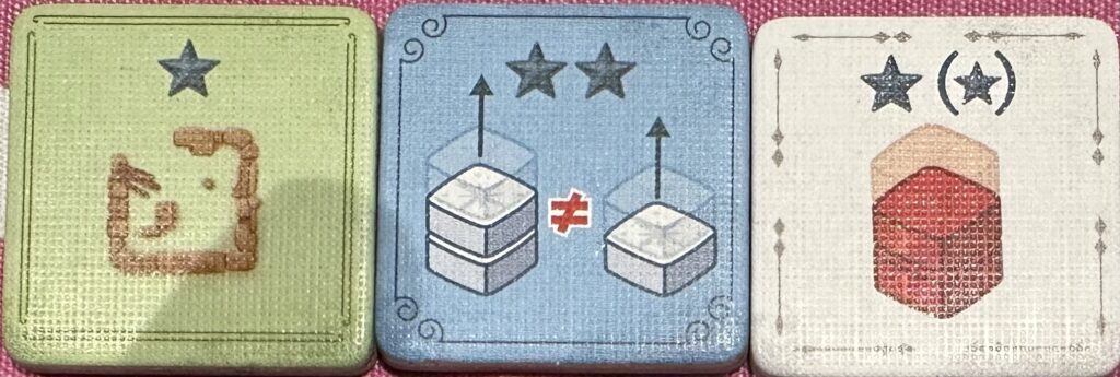 Après avoir placé sa tuile et son premier jeton, on a le choix entre placer un second jeton sur le plateau ou à prendre une des tuiles PVs bonus qui va rapporter des PVs immédiats en fonction de certaines conditions. En général, au début de la partie, ces tuiles ne sont pas intéressantes mais au fur et à mesure de l’avancé du jeu, elles peuvent rapporter pas mal rendant le choix intéressant car souvent, ces PVs immédiats sont à contrebalancer avec la perte d’une majorité. J’ai néanmoins trouvé dommage que certaines de ces tuiles peuvent rapporter beaucoup plus de PVs que d’autres et comme on en retourne une nouvelle dès qu’on en a pris une, le hasard de la pioche peut signifier le jackpot!