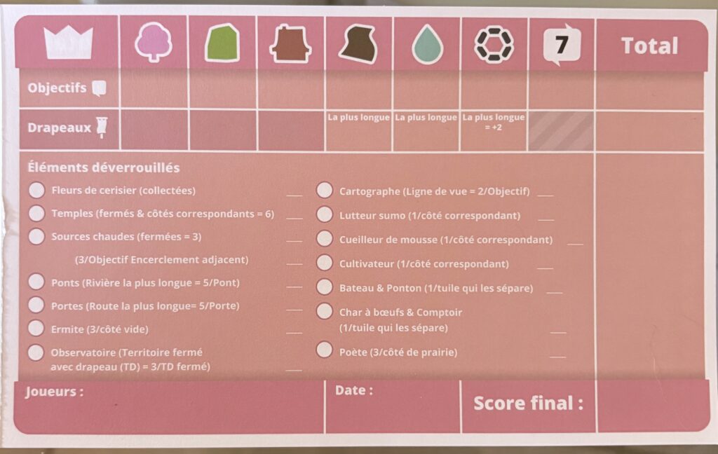 Je déconseille cependant les parties en grand groupe. Pour moi la meilleure configuration est à deux. Seul, on perd la partie discussion et c’est agréable d’échanger ses points de vue. Mais à partir de trois, les parties s’éternisent et puis, comme les actions se limitent à poser une tuile, le temps peut vite devenir long…