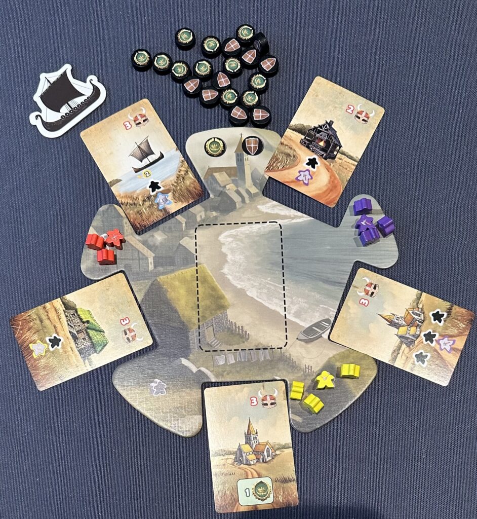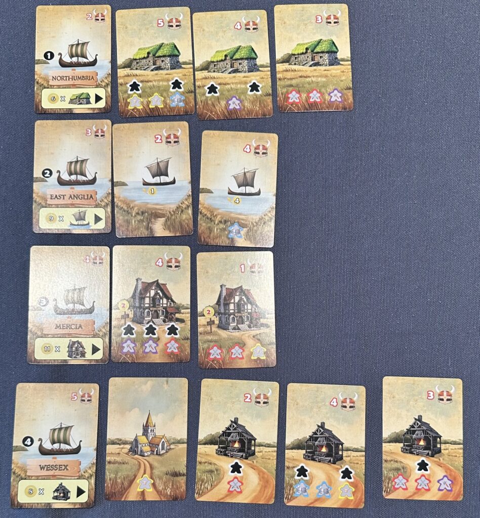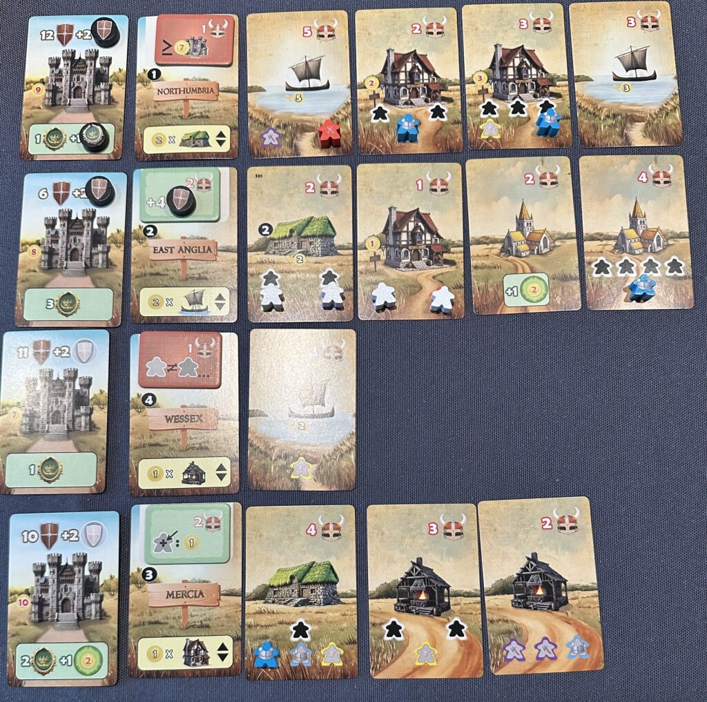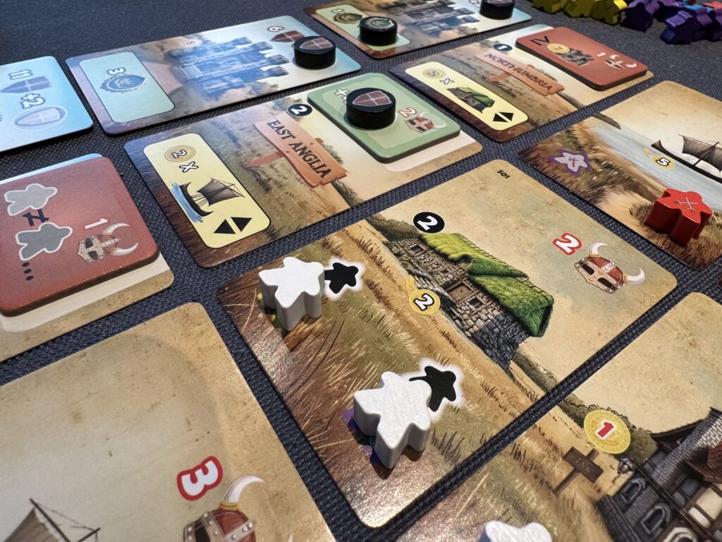 Tout d’abord, la construction de tableau n’exige pas de placer une carte à côté d’une autre ou d’avoir une ligne avec 3 symboles différents pour marquer des points de prestige. Ici, on ajoute des bâtiments à nos royaumes en tenant compte de leur valeur Vikings. Cette valeur indique quelle défense on doit prévoir pour contre les attaques en fin de partie. C’est finalement plutôt simple et pas du tout calculatoire.