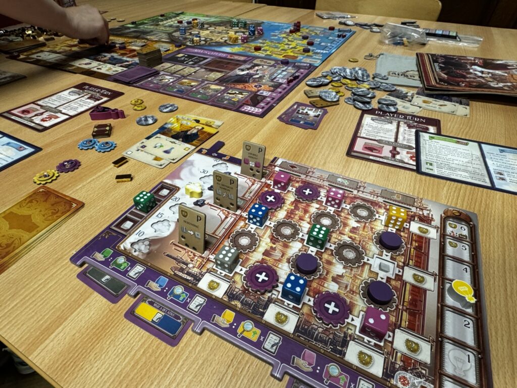Le jeu est un draft de dé en 2 étapes. A son tour, un joueur a droit à réaliser une des deux actions possibles : soit prendre un des dés disponibles et le placer dans sa réserve, soit placer un dé de sa réserve sur un des emplacements de dés de son plateau personnel et réaliser l’action correspondante à la couleur du dé. Même si cette temporisation peut parfois aider, j’ai trouvé cette mécanique un peu lourde et aurait préféré une mécanique où on joue directement le dé drafté. Ca aurait plus dynamisé le jeu.