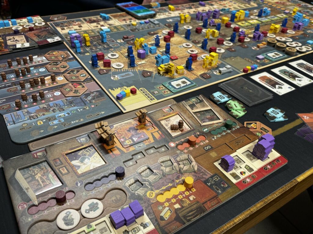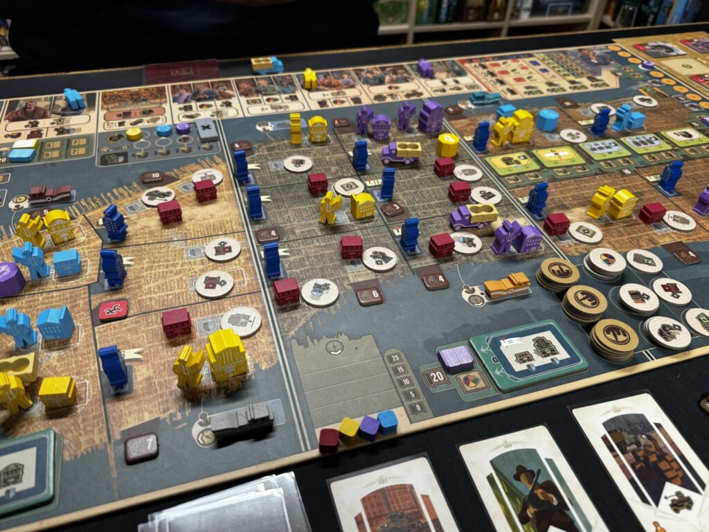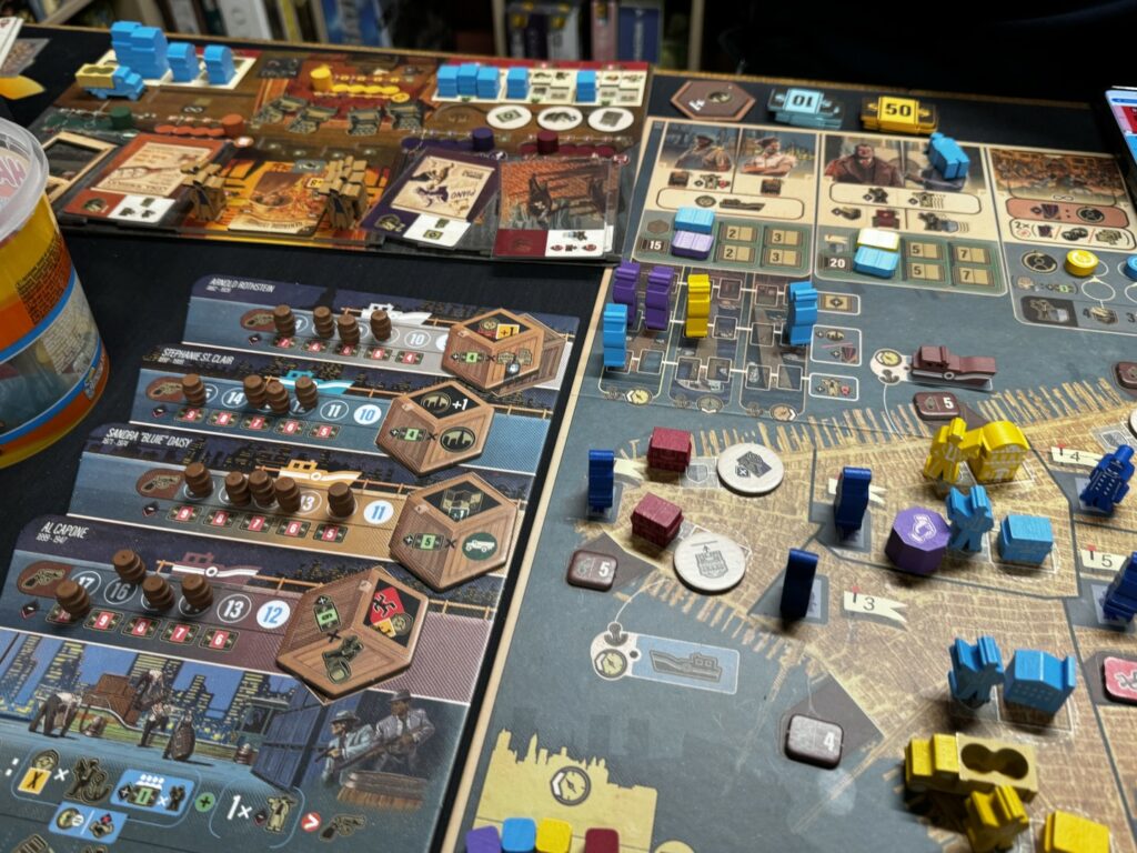 Car oui, il y a des axes stratégiques dans le jeu : réaliser des objectifs, se concentrer sur la fabrication et la vente d’alcool, se concentrer sur son réseau de speakeasy afin d’obtenir les majorités de construction par district ou piller des bateaux. Même si on a réellement 2 grands axes stratégiques : la vente d’alcool ou le gain des majorités. Les deux autres arrivent juste en soutien mais ne peuvent pas rivaliser en hauteur de gains. Et si on se concentre sur un de ces axes, on ne pourra pas faire grand-chose. En général 2 ou 3 ventes d’alcool par partie, c’est peu. Evidemment, cela permet d’éviter la répétitivité mais quand on sait que c’est le thème du jeu, ça fait un peu bizarre de ne suivre que si peu souvent.