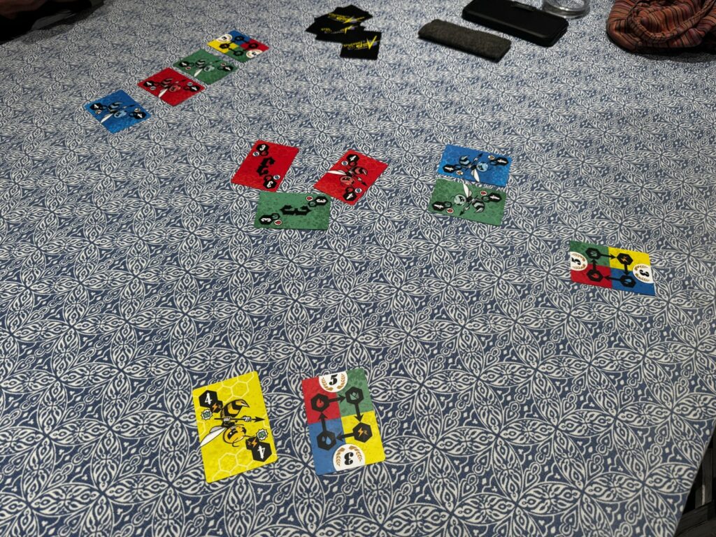 Sa seconde originalité (qu’on rencontre assez souvent ces temps ci il faut le dire) est que chaque couleur va de 1 à 5 et comporte 2 « 4 » et 2 « 5 ». Les 2 « 4 » et les 2 « 5 » présentent une guêpe sur leur face. Chaque guêpe récoltée dans un pli vaut 1 point mais attention, si on ramasse 2 guêpes de même couleur et même valeur, on est immédiatement éliminé de la manche durant laquelle on ne récoltera aucun point! Oui, ça fait mal! Je dirais même que ça vous élimine d’office de la partie! Ca peut être frustrant surtout qu’on peut rarement y faire quelque chose. De plus, si 2 cartes de même valeur et de même couleur sont jouées dans un pli, la première jouée est la plus forte. Si vous voyez un « 4 » ou un « 5 » et que vous avez l’autre, vous vous ferez un malin plaisir à le jouer 😉