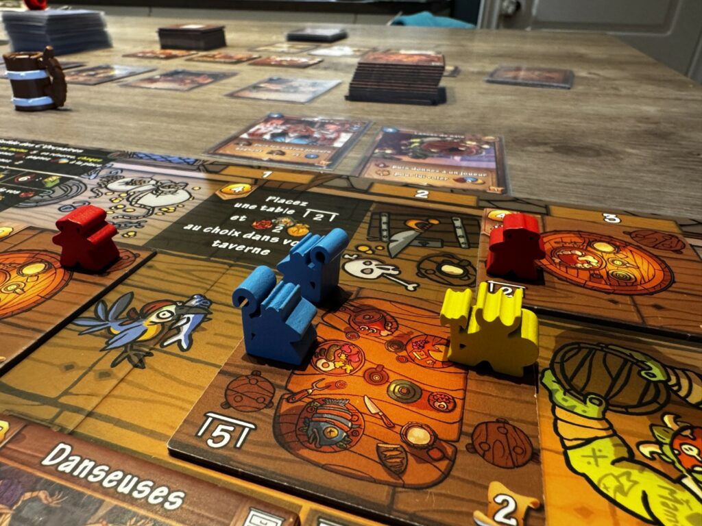 Vous allez pouvoir acheter ou améliorer de nouvelles tables capables d’accueillir plus d’aventuriers ou du mobilier qui vous rapportera des capacités permanentes comme de pouvoir piocher une carte supplémentaire, pouvoir considérer un aventurier d’une race comme une autre race (considérer un orc comme un elfe par exemple), gagner plus de ressources selon certaines circonstances ou pouvoir jouer plus de cartes.