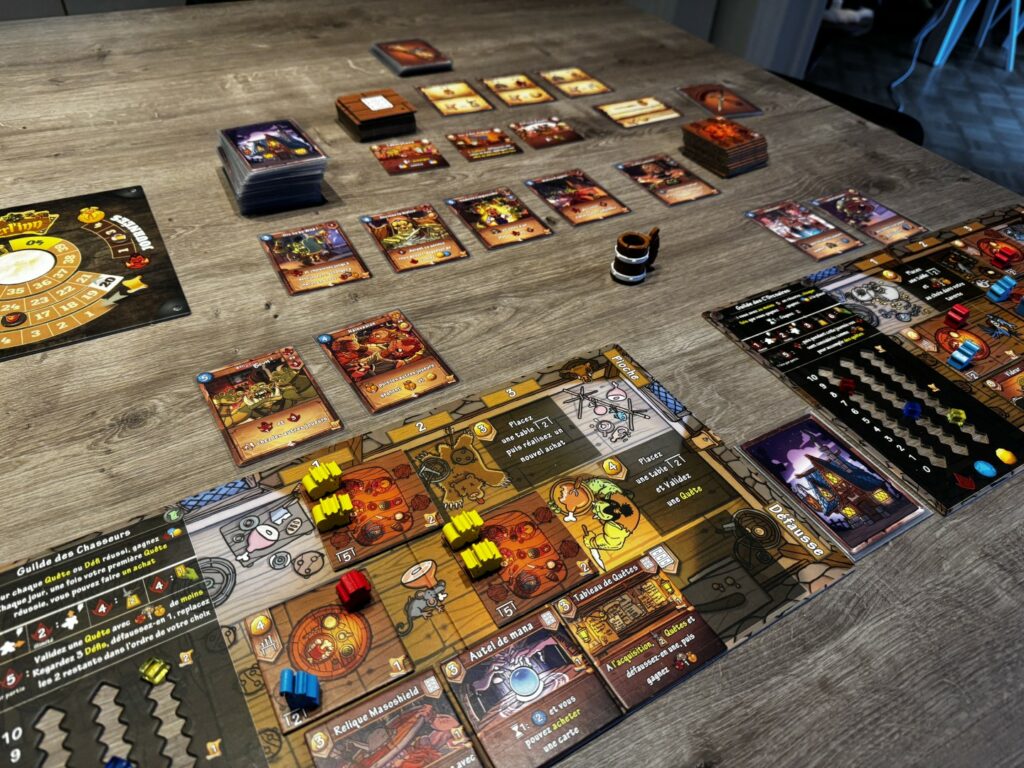 Merl’inn se joue en en 4 manches, chacune subdivisée en 3 tour. Un tour de joueur se décompose en 4 phases. Durant la première il va être obligé de jouer une des cartes de sa main en payant son coût et gagnant ses effets. Durant la seconde il pourra réaliser un achat. Durant la troisième il pourra réaliser une action malice. Et durant la dernière, il pourra réaliser des actions gratuites. A noter que ces phases peuvent se jouer dans n’importe quel ordre, apportant pas mal de souplesse au jeu.