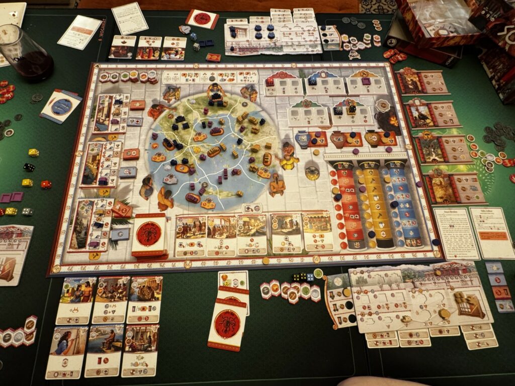 Les effets des dieux vont dépendre du nombre de tributs payés. Ils vont permettre de gagner des ressources, de gagner des tuiles commerce, de progresser sur une échelle, de glisser une carte sous son plateau, de gagner et de placer des soldats ou de gagner pas mal de PVs selon certaines conditions (par tuile commerce, par ferme, selon votre niveau sur une échelle ou selon les tuiles marins vaincus).