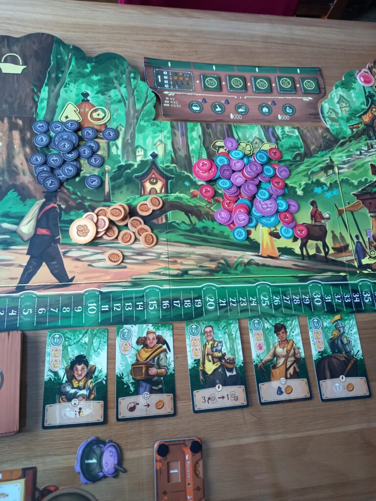 Lors des 6 manches, vous allez pouvoir faire 5 actions mais l’ordre du tour dépendra de votre programmation. Chaque joueur insére secrètement des tuiles numérotées dans une glissière d’actions afin de définir leur priorité. Le joueur avec le numéro le plus bas commencera l’action en premier. Mais que se passe-t-il en cas d’égalité me direz-vous. Les égalités sont départagés par les jetons chaudrons qui sont immédiatement échange après avoir départagé deux ex-aquo. Vous avez également la possibilité de ne pas faire une action et de gagner une ou deux pièces.
