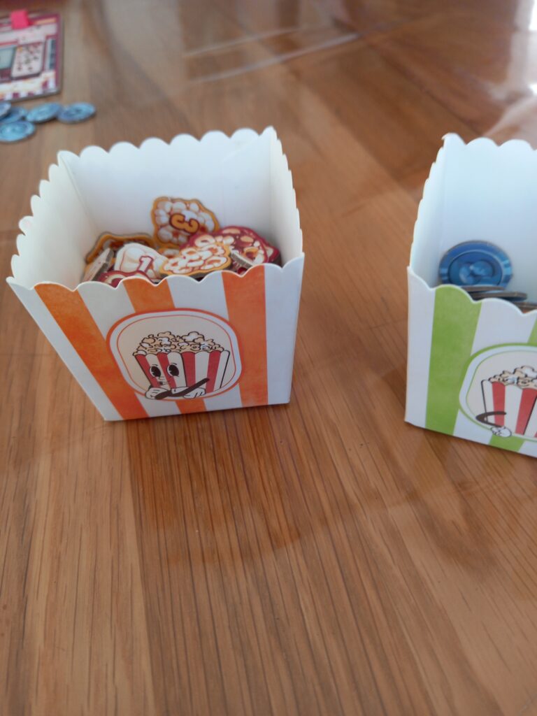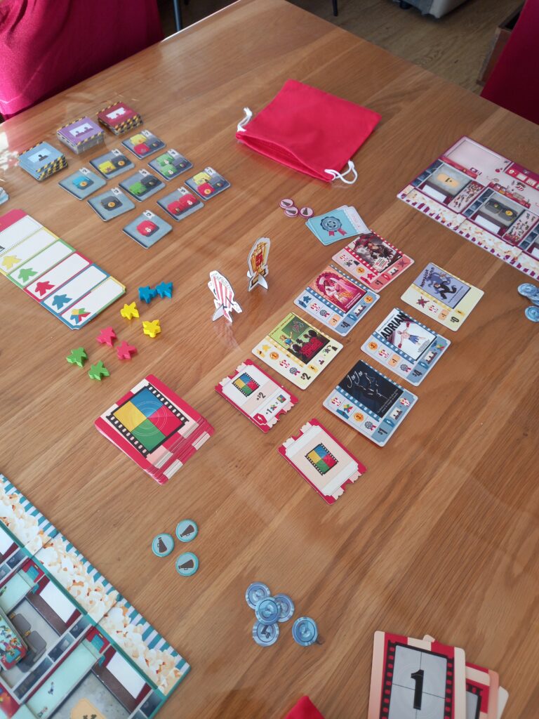 Au fil des manches, il vous faudra mettre des films à l’affiche, créer des salles et satisfaire les spectateurs pour gagner un maximum de pop corn. Oui les points de victoire se comptent en pop corn. Le matériel de jeu favorise l’immersion. En début de manche, vous pouvez acheter un film à mettre à l’affiche. Il vous faudra choisir entre les film de la semaine et les avant première. Ces dernières coûtent 2 sous de plus mais vous font gagner un spectateur de la couleur du film à mettre dans votre sac.
