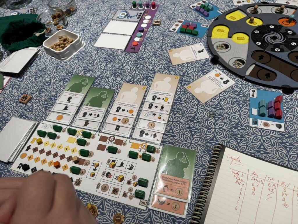 Tempestia est un jeu prometteur. Sa date de sortie n’est pas encore fixée mais le proto sur lequel nous avons joué est déjà très abouti et nécessite encore très peu d’équilibrage. Je ne serais pas étonné qu’il sorte d’ici environ un an. Il nous a tous convaincu. Son interaction est limitée aux emplacements de bâtiments et à la dispute des cartes à acquérir tant et si bien que la tension qu’il procure est assez faible. Son thème n’est pas prédominant si ce n’est dans son système ingénieux des tempêtes. Ce système de tempête est vraiment génial et mixé à des mécaniques plus connues comme de la combinaison de cartes, des capacités permanentes à acquérir, des bonus à déclencher et des manières personnelles de gagner des PVs il offre une expérience complète et assez ludiquement jouissive. Deux grandes stratégies s’affrontent dans Tempestia: l’aquisition des cartes, l’optimisation des PVs qu’elles génèrent et des combos déclenchées face à une stratégie plus simple à mettre en place de construction de bâtiments et d’optimisation des PVs générés. Ces deux stratégies sont bien équilibrées et aucune ne prévaut par rapport à l’autre. Vous allez généralement aller à fond dans l’une tout en ne négligeant pas la seconde ce qui va donner un mélange subtil et unique à chaque partie.