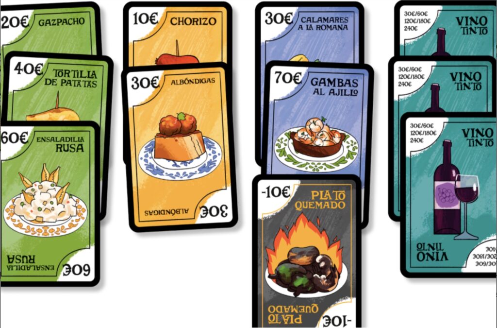 Avec une main de 5 cartes au départ, chaque joueur joue une carte. En général, il s’agît d’une carte Tapas, c’est à dire une commande de Tapas dont le coût s’ajoute à l’addition totale (au centre de la table).