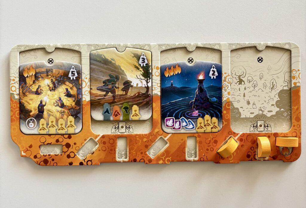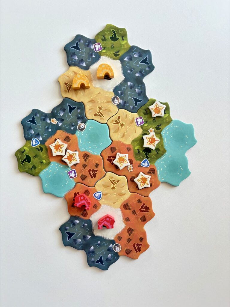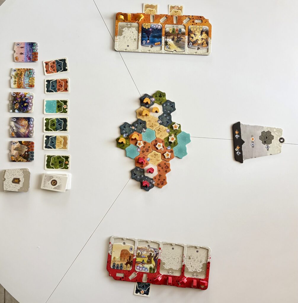 Premièrement, il est doté d’un très bon matériel et de magnifiques illustrations. Les plateaux sont double couche, les tuiles et les jetons en carton très épais et un thermoformage en carton également bien pensé. C’est vrai que la qualité du matériel n’est pas primordial mais, ça donne quand même le sourire quand un jeu est d’envergure. Deuxièmement, la simplicité du gameplay. À son tour, le joueur peut soit prendre deux cartes adjacentes de la rivière, soit placer un de ses camps sur la carte. Et c’est tout ! Pourtant, malgré la simplicité des règles, Dewan délivre un vrai plaisir et demande de la réflexion afin de réussir à marquer le plus de points.