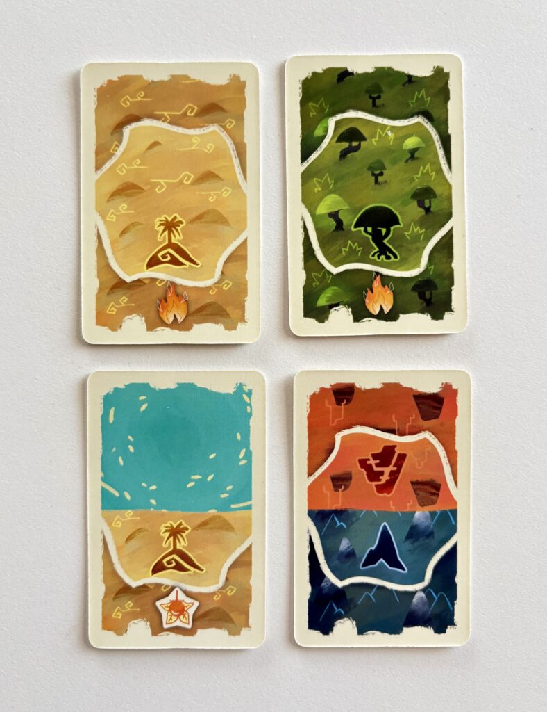 Bien choisir ses cartes est vraiment très important mais il est obligatoire d’en prendre deux adjacentes parmi les six proposées. Ces dernières représentent des terrains et elles peuvent être doubles et même comporter des ressources. Pour construire un camp il faut défausser les cartes correspondantes aux terrains que l’on souhaite traverser. Comme c’est très thématique, c’est facile à comprendre. Une subtilité apparaît tout de même, puisque si l’on traverse un terrain déjà occupé par un autre joueur, il faut lui donner la carte au lieu de la défausser. Parfois, faire un petit détour peut être une meilleure option !