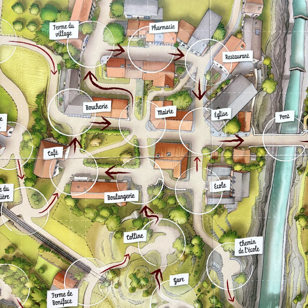 Le plateau de jeu représente la ville de Pontain l’Ecluse avec ses bâtiments, ses forêts et ses routes. Le jeu propose 6 scénarios à jouer de préférence dans l’ordre puisque la difficulté est progressive.