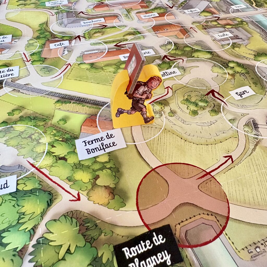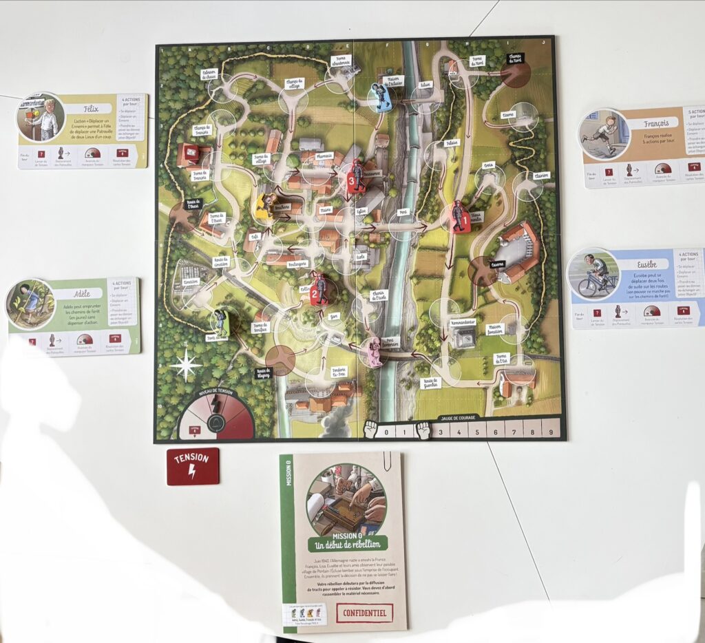 Les actions de base des personnages permettent de se déplacer dans la ville, de prendre et d’utiliser des objets, de déplacer un ennemi ou d’utiliser une action spéciale de la mission. Il faut donc planifier astucieusement ses actions avec ses partenaires en utilisant au mieux les pouvoirs des enfants puisque chacun d’eux a une capacité unique dont il faut se servir à bon escient. Par exemple, François a 5 actions au lieu de 4, Adèle peut se déplacer en forêt sans dépenser d’action ou encore Simone qui peut croiser une patrouille sans augmenter le marqueur Tension. Effectivement, la tension et la peur sont palpables à cette époque. C’est pourquoi, le jeu possède un cadran Tension qui oblige à piocher une carte et à effectuer ses injonctions à chaque fois que le cadran fait un tour complet. De manière très thématique, croiser un soldat fait immédiatement augmenter la tension !
