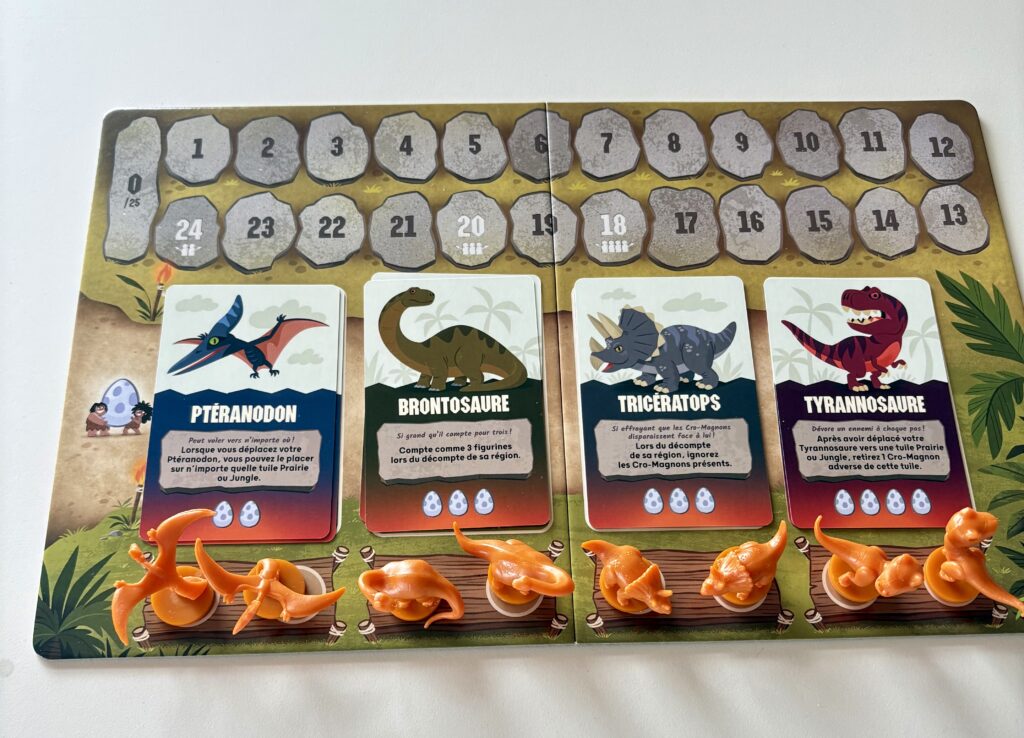 En fonction de l’espèce convoitée, il faudra envoyer de deux à quatre Cro-Magon pour couver l’œuf mais une fois éclos, il rejoindra votre tribu et appliquera les actions des dés comme les meeples (mais en plus classe car les dinos ont fière allure sur le plateau). L’ajout des dinosaures et de leur pouvoir pimente les parties.