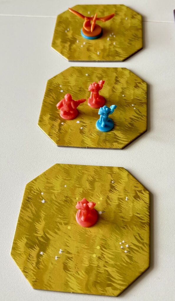 Les tuiles composant l’aire de jeu sont de trois types : les prairies, la jungle et les lagons. Les tuiles identiques adjacentes forment des zones. Les joueurs majoritaires sur ces emplacements lors du déclenchement du scoring marquent 1 point par tuile composant cette zone. Quand les dés permettent de déplacer vos meeples, il faut le faire en gardant en tête ce point de règle. Mais tout n’est pas aussi simple puisque le joueur qui place un de ses Cro-Magon sur le volcan pour adorer la montagne de feu, peut modifier le terrain s’il est majoritaire sur le volcan. Pour cela, il fait glisser la ligne ou la colonne qui contient le volcan. Ce faisant, il a la possibilité de casser des zones et d’en reformer d’autres, de quoi mettre en colère ses adversaires !