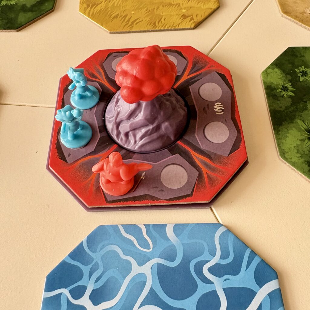Le volcan est associé à une tuile différente. Sur cette dernière se trouve un certain nombre d’emplacements pour les Cro-Magnon adorateur. Quand toutes les places sont occupées, un scoring se déclenche. Il faut donc surveiller ce volcan attentivement afin de ne pas être pris de court. Une fois que tous les joueurs ont marqué leur point, les meeples du volcan sont remis dans les réserves des joueurs. Par contre, sur les zones de terrain, seuls ceux qui étaient majoritaires sont retirés. Ceci signifie donc, que les autres joueurs également présents sur ces endroits, se trouvent bien positionner pour gagner des points lors du prochain scoring.