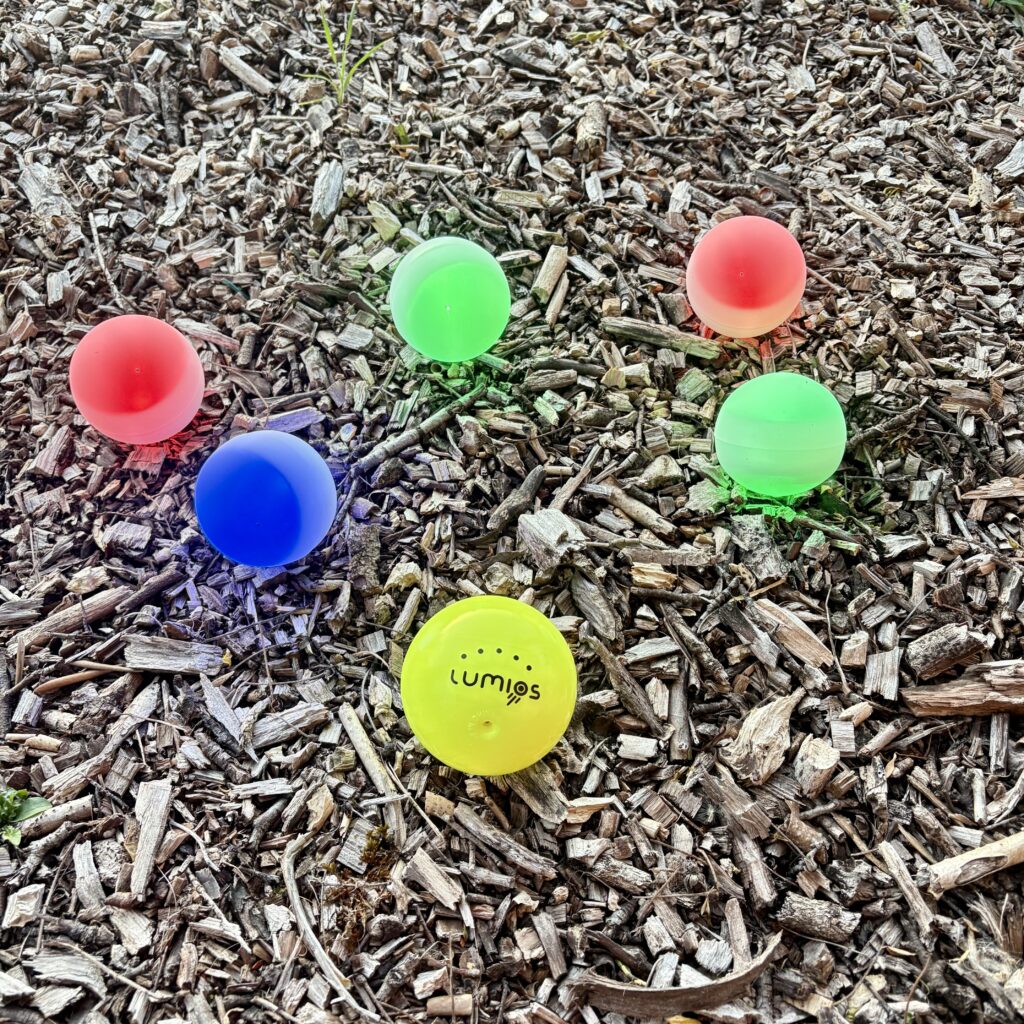 Lumios est en réalité une pétanque lumineuse composée de cinq boules et d’un cochonnet appelé Luminator. Par équipe de deux, il faut mettre les cinq boules à sa couleur (vert ou bleu) pour gagner. Pour cela rien de plus simple (sur le papier) puisqu’il faut juste les toucher avec le luminator. Si la boule était bleue, elle devient verte et inversement.