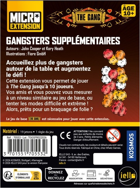 Avec The Gang, Iello proposait un petit jeu de poker coopératif malin, tendu et étonnamment interactif. L’extension Gangsters supplémentaires pousse le concept encore plus loin en permettant d’embarquer jusqu’à 10 joueurs dans le même braquage. Une promesse simple, mais qui change profondément l’expérience de jeu.